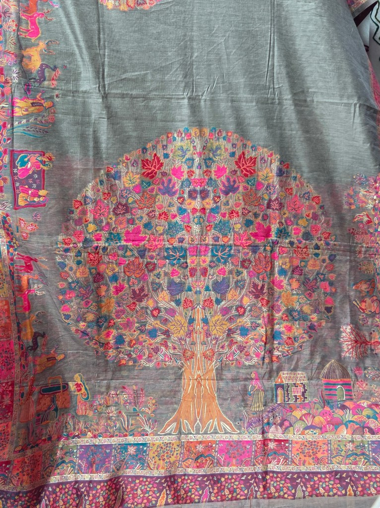 Textile from a Botanist’s Eye – Paper mulberry (*Broussonetia papyrifera* bark) lwith cotton used in traditional fiber crafts to make a naturally breathable, plant-based mulburry cotton fabric, originally from Kashmir…. artistically woven using the *Kani* technique, where deodar wood bobbins are used to create intricate patterns against the cotton base.